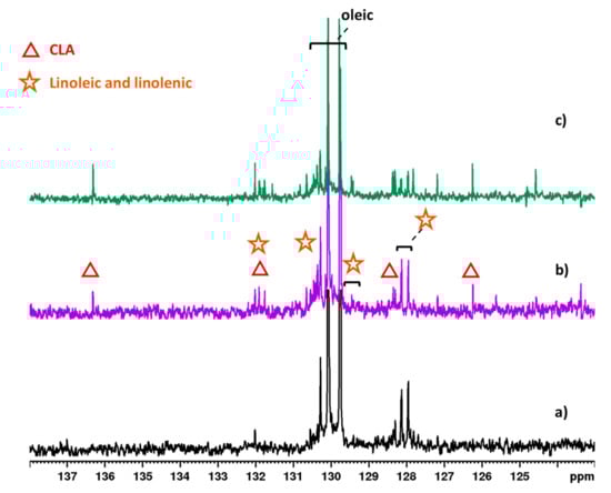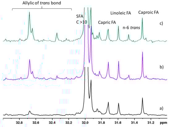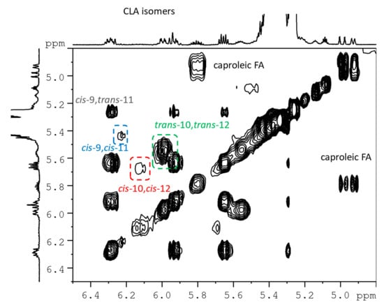 In previous studies, the lipid profile of milk and dairy products has been studied by high-resolution NMR spectroscopy for differentiating the animal provenience [,,,], while other studies reported the presence of different CLA isomers [,,].