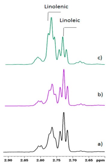 Bis-allylic methylene region of 600 MHz 1H NMR spectra of goat milk lipid fraction from (a) control, (b) hempseed, and (c) linseed diets in CDCl3 at 298 K. Changes in the signal ratios of linoleic acid and linolenic acid depending on the diets are clearly visible.