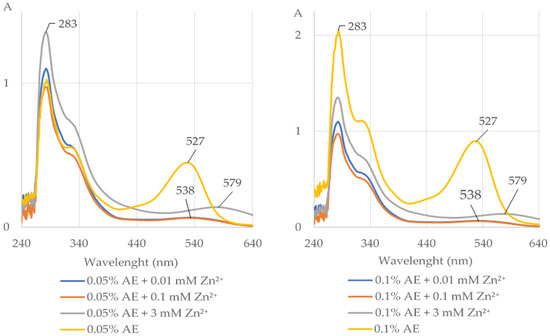 The UV–Vis absorption spectra (with indicated maximum absorption) of the extract from Aronia melanocarpa L. berries (0.05% and 0.1% AE) alone and after addition of divalent ions of zinc (Zn2+) at the concentrations of 0.01, 0.1, and 3 mM at pH 5.5. The shift of the maximum absorption after addition of Zn2+ to the AE indicates that the extract chelated these ions. A, absorbance.