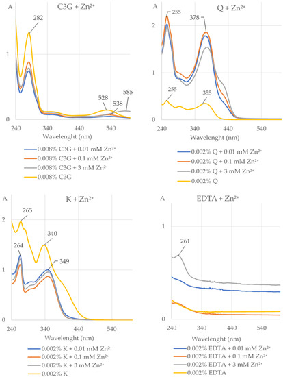 The UV–Vis absorption spectra (with indicated maximum absorption) of cyanidin 3-O-β-galactoside (0.008% C3G), quercetin (0.002% Q), kaempferol (0.002% K), and ethylenediaminetetraacetic acid (0.002% EDTA) alone and after addition of divalent ions of zinc (Zn2+) at the concentrations of 0.01, 0.1, and 3 mM at pH 5.5. The shift of the maximum absorption after addition of Zn2+ to the solution of the investigated compound indicates that this compound chelated these ions. A, absorbance.