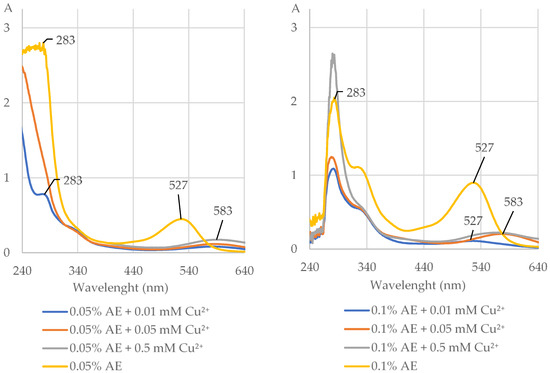 The UV–Vis absorption spectra (with indicated maximum absorption) of the extract from Aronia melanocarpa L. berries (0.05% and 0.1% AE) alone and after addition of divalent ions of copper (Cu2+) at the concentrations of 0.01, 0.05, and 0.5 mM at pH 5.5. The shift of the maximum absorption after addition of Cu2+ to the AE indicates that the extract chelated these ions. A, absorbance.