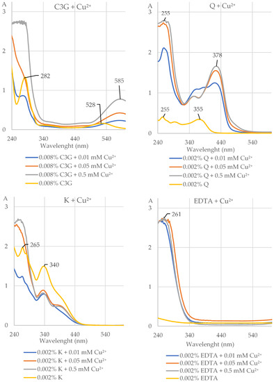 The UV–Vis absorption spectra (with indicated maximum absorption) of cyanidin 3-O-β-galactoside (0.008% C3G), quercetin (0.002% Q), kaempferol (0.002% K), and ethylenediaminetetraacetic acid (0.002% EDTA) alone and after addition of divalent ions of copper (Cu2+) at the concentrations of 0.01, 0.05, and 5 mM at pH 5.5. The shift of the maximum absorption after addition of Cu2+ to the solution of the investigated compound indicates that this compound chelated these ions. A, absorbance.
