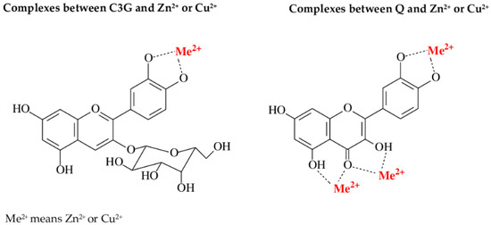 The possible complexes between cyanidin 3-O-β-galactoside (C3G) and quercetin (Q) and divalent ions of zinc (Zn2+) and copper (Cu2+).