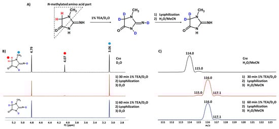 According to our previous study [14,17], we tested the influence of the 1% TEA/D2O solution on the HDX at the α-C of the other N-methylated amino acid part as milder reaction conditions. In our experiment, Cre samples were incubated from 30 min to 6 hours at room temperature in the D2O solution containing 1% of TEA. The progress of HDX was monitored by ESI-MS and 1H-NMR (Figure 1B,C).
