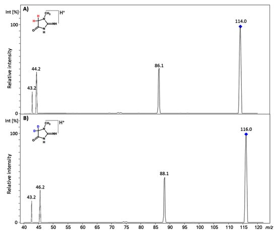 (A) ESI-MS/MS spectra of protonated creatinine and (B) the obtained deuterated creatinine isotopologue. (A) parent ion 114.0, collision energy 45 eV; (B) parent ion 116.0, collision energy 45 eV.