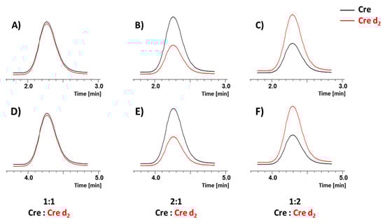 Extracted ion chromatograms of non-deuterated (Cre, black line) and deuterated (Cre d2, red line) creatinine samples obtained on the (A–C) C18 and (D–F) HILIC Luna column, mixed in different ratios: (A, D) 1:1; (B, E) 2:1 and (C, F) 1:2. The signal intensities correspond to the amount of isotopologues present in the analyzed samples.