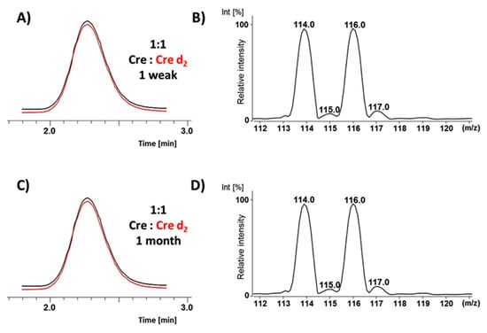 The (A, C) LC-MS and (B, D) ESI-MS analysis of the stability of the obtained deuterated Cre standards after (A, B) one week and (C, D) one month of storage in the mixture of H2O/MeCN/HCOOH (1:1:0.1 v/v/v). Extracted ion chromatograms of non-deuterated (Cre, black line) and deuterated (Cre d2, red line) creatinine samples mixed in a 1:1 ratio.