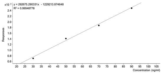 To confirm the applicability of the obtained deuterated analogues of creatinine in the quantitative LC-MS analysis, the urine samples from three different patients were investigated. Fixed concentrations of Cre corresponding to 30, 50, 90 and 100 mg/dL were prepared by sequential dilutions of the stock solutions. The calibration curve (Figure 5) was constructed by plotting the peak area ratio of each compound to I.S. (y) versus the concentration of the compounds (x, mg/dL). The measurements were repeated 5 times. The results after LC-MS quantitation were compared with the amount of creatinine, determined using Jaffe test, and are presented in Table 1.