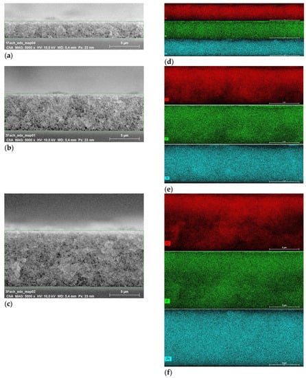 In order to obtain the desired Pt loading, the catalyst layers were produced by printing various layers on top of each other. It is, hence, important to understand the interaction between these layers and how such a production step affects the interface between them. To do so, SEM images of three catalyst layers were taken and analyzed, as shown in Figure 1. As it can be seen from Figure 1a–c, there are no obvious interfaces visible that would indicate that interfacial effects might influence the performance of the layers. In Figure 1d–f, EDX distributions of carbon, fluorine and platinum are shown, where it can be seen that the ionomer, catalyst and support are homogeneously distributed throughout the different layers, regardless of the number of layers used for the production of the catalyst layer.
