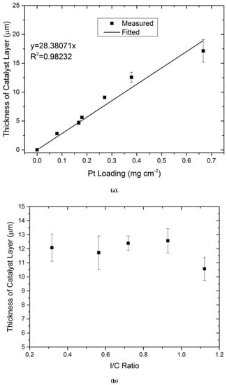 Dependence of catalyst layer thickness for the 40 wt% catalyst. (a) Measured thickness with an ionomer content of 35 wt.% dependent on the platinum loading, (b) effect of ionomer content on the thickness of the catalyst layer with Pt loading of 0.40 mg/cm2.