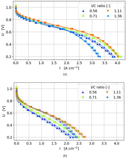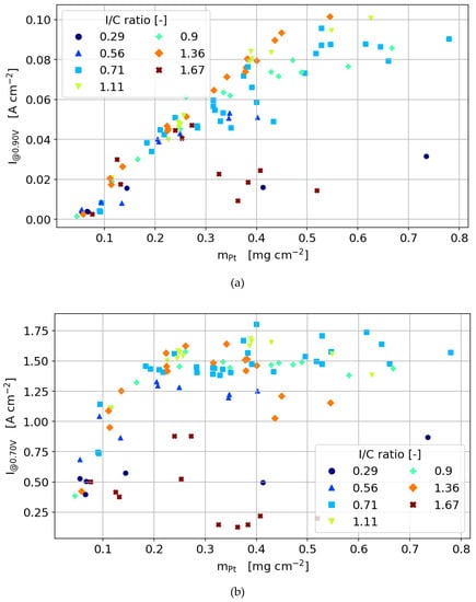 In the activation region in Figure 5a, a linear trend is measured for the dependency of the current density on the Pt loading, implying that the oxygen and proton transport effect on the performance is negligible due to the low reaction rates. However, for the catalyst layers with the highest and lowest ionomer content, the voltage losses due to proton transport and oxygen diffusion, respectively, are found to be high enough for a significantly lower current density for thick catalyst layers. The linear dependency measured for I/C ratios of 0.62–1.36 confirms the previous finding that, independent of the number of layers printed on top of each other, the whole catalyst layer thickness is electrochemically active and the layers are connected to both the protonic and electronic phases.