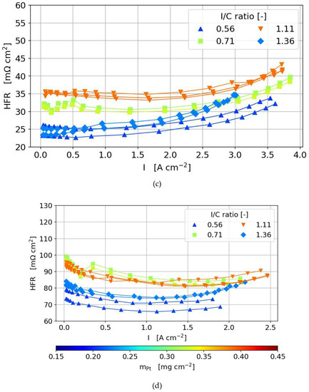 Prior to investigating the effects of the catalyst layer ingredients on the performance of the cell, it is important to establish the reproducibility of the production and characterization method of the CCMs. In Figure 3a,b, the polarization curves under the wet and dry conditions of various CCMs with different Pt loadings and I/C ratios are given. Figure 3c,d shows the corresponding high frequency resistance (HFR) measurements during the polarization curves. As it can be seen, the production method used in this study results in reproducible catalyst layers and characterization results.
