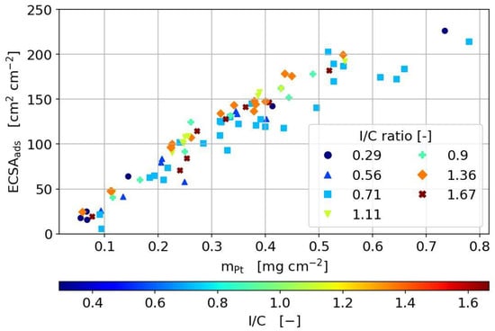 The cyclic voltammetry was used in this study in order to estimate the electrochemical surface area (ECSA) for all produced catalyst layers. As shown in Figure 4, the ECSA is plotted against the Pt loading for various I/C ratios. The Pt loading was determined by weighing the catalyst layers after drying on the decal foil with the assumption that all solvent evaporates completely during drying. The ECSA was obtained by integrating the hydrogen adsorption current in the cyclic voltammograms until a fixed potential limit of 90 mV.