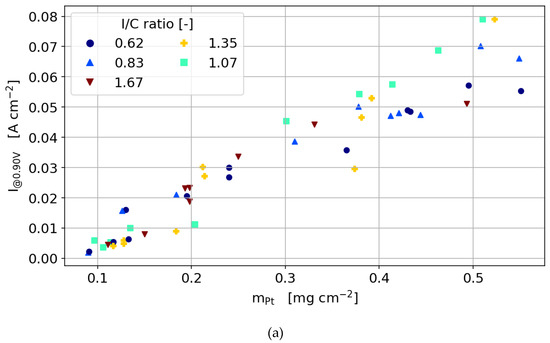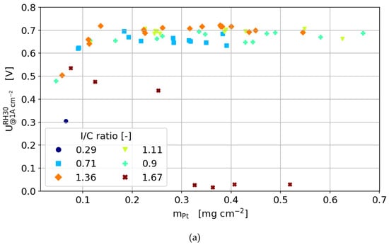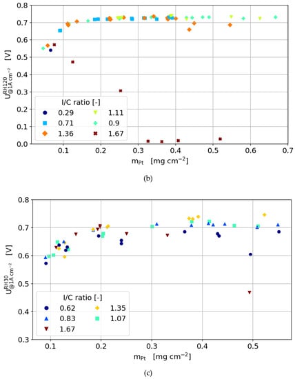 In Figure 5c, the cell current at 300 mV also shows a distinct optimum for the platinum loading that is also dependent on the ionomer content. Here, differences between the ionomer contents are more pronounced with the optimum at 300 mV around 0.2 mg Pt cm−2 compared to 0.3 mg Pt cm−2 at 700 mV.