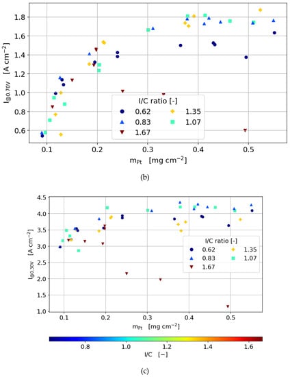 The current density dependency on the Pt loading and I/C ratio at cell voltages of (a) 900 mV, (b) 700 mV and (c) 300 mV for a catalyst of 40 wt% Pt/C.