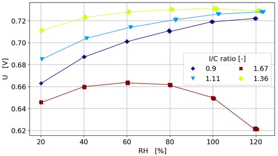 Relative humidity sweeps dependent on I/C ratio for Pt/C 40wt.% and a Pt loading of 0.25 mg cm−2 at a current density of 1.0 A cm−2.