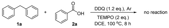 To gather more information about the reaction mechanism, the radical scavenger 2,2,6,6-tetramethyl-piperidine-1-oxyl (TEMPO) was added. No product was obtained from the reaction between diphenylmethane and benzoic acid with the influence of two equivalents of TEMPO (Scheme 1). This indicates that the present reaction process may involve radical intermediates.