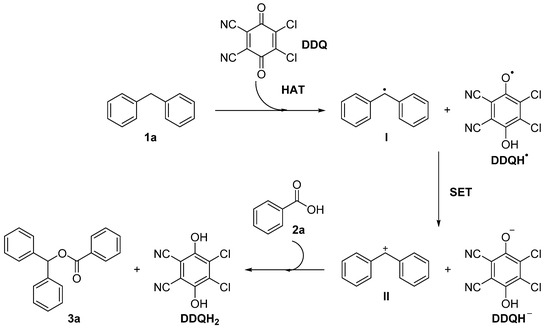A plausible mechanism to rationalize this transformation is illustrated in Scheme 2. The reaction of DDQ with diphenylmethane 1a generates a benzyl radical I and DDQH· via hydrogen atom transfer (HAT). The radicals continue to be transformed into the corresponding benzyl cation and DDQH anion via single electron transfer (SET) [17,18]. Finally, the benzoic acid 2a of the proton is abstracted by DDQH– and reacts with the cation II to obtain the desired product 3a and reduced hydroquinone DDQH2. However, the reason why the reaction only works well in chloro-containing solvents is not clear at this stage.
