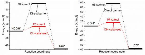 Oxhydryl dehydrogenation of isolated HxCOH* (x = 3, 2, 1, 0), HxCOH* + * → HxCO* + H*, and that assisted by co-adsorbed OH, HxCOH* + OH* → HxCO* + H2O*, were considered. The activation barriers of the two types of dehydrogenation reactions were compared in Figure 1.