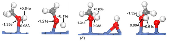 Structures and Bader charges in the oxhydryl dehydrogenation of HxCOH with and without co-adsorbed OH: (a) x = 0, (b) x = 1, (c) x = 2, (d) x = 3. From left to right: local minimum and transition state structures of HxCOH without and with co-adsorbed OH.