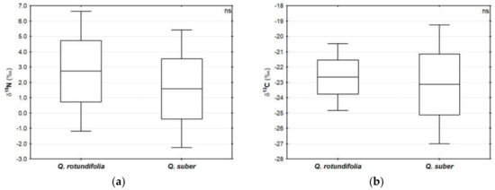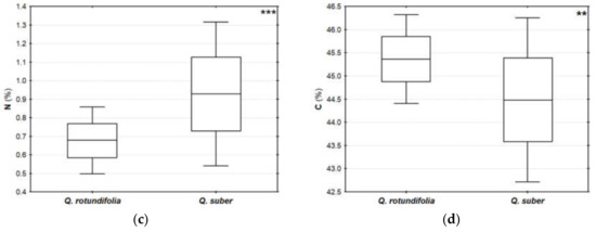 No differences were found in nitrogen or carbon isotope compositions (δ15N, δ13C) between Quercus species (Figure 1a,b, respectively), with δ15N ranging from −1.1‰ to 6.9‰ and δ13C from −27.3‰ and −20.0‰. Contrastingly, the nitrogen and carbon contents differed significantly among species (Figure 1c,d, respectively), with mean contents of 0.7% ± 0.1% (N) and 45.4% ± 0.5% (C) in QR acorns, and of 0.9% ± 0.2% (N) and 44.5% ± 0.9% (C) for QS acorns. To the best of our knowledge, scarce information regarding acorns’ nitrogen and carbon isotopic composition or N and C contents is available in bulk samples with values of ca. −21.0‰ for δ13C of Q. ilex being reported [19,20].