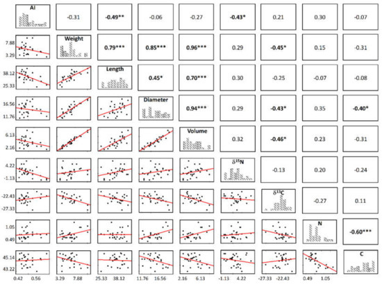 In view of the non-significant differences (p > 0.05) between Quercus species regarding isotopic composition, the dataset was further analyzed disregarding the species effect. To test the association between morphological and physiological traits with the aridity index (AI), we used Spearman correlations (Figure 2).