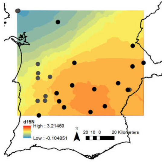 All these relations can be perceived as a first approach towards determining the geographical origin of the black Iberian pig. Its intrinsic characteristics could, in fact, be framed into the ecosystem unique dynamics using acorn isotopes—the main source of feed. Thus, acorn isoscapes of nitrogen were developed as a stepping stone for the provenance of the Alentejano pig. Multivariate analysis and geospatial data analysis were applied to illustrate the result of the correlation between acorn δ15N isotopic composition and environmental variables, as shown in Figure 3.