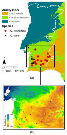 The study was conducted in Mediterranean cork-oak, holm-oak, and mixed Montados randomly distributed at the Portuguese Alentejo region (Figure 4a), as to cover main production areas of the Alentejano pig breed (validated by the Associação de Criadores de Porco Alentejano (ACPA), association of Alentejano pig breeders) and to account with variability in climatic characteristics. Twenty-eight sampling sites were distributed in Montados throughout a spatial gradient of aridity: 15 for Quercus rotundifolia (QR) and 13 for Quercus suber (QS). The aridity index values (Figure 4b) ranged from 0.422 to 0.627 (data for the period of 1970–2000 obtained from the CGIAR-CSI global aridity database (http://www.cgiar-csi.org/data/global-aridity-and-pet-database) [46]). For QR sampling sites, the aridity index varied from 0.422 to 0.582, while in QS sites it ranged from 0.446 to 0.627. Five to ten adult oak trees (QR and QS) were selected in each sampling site. Ten acorns were sampled from random branches per individual tree between October and December 2017.