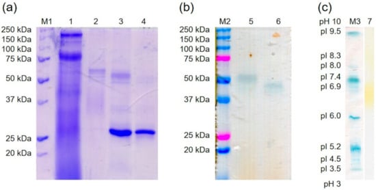Purification of the recombinant PsaPOX by Ni-IMAC. (a) SDS-PAGE stained with Coomassie Brilliant Blue. 1: flow through, 2: elution fraction, 3: elution fraction incubated with EndoH, 4: EndoH, M1: molecular mass marker. (b) Semi-native PAGE stained with ABTS in the presence of hydrogen peroxide. 5: elution fraction, 6: elution fraction incubated with EndoH, M2: pre-stained molecular mass marker. (c) Isoelectric focusing gel. 7: elution fraction stained with phenylendiamine in the presence of urea peroxide. M3: standard protein marker for isoelectric focusing stained with Coomassie Brilliant Blue.