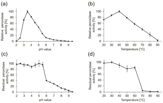 The influence of pH and temperature on PsaPOX activity and stability was determined using ABTS in the presence of hydrogen peroxide as substrate (Figure 5). The enzyme showed a pH optimum of 3.5 while more than 50% of activity was conserved between pH 3 and 5 (Figure 5a). At lower or higher pH values of ≤ 25% of activity remained, most likely due to conformational changes of the enzyme. The results were consistent with the findings for other fungal DyPs, which had pH optima in the range between pH 2 and 5 [,,]. PsaPOX showed the highest pH stability with a residual peroxidase activity of ≥90% between pH 2.0 and 5.5 after 1 h of incubation (Figure 5c). At pH values higher than six, near the isoelectric point, the stability decreased drastically, probably due to a reduced solubility and changes of the protein structure, which may have resulted in protein aggregation.