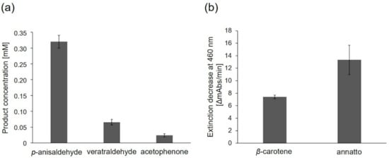Alkene cleavage activity of PsaPOX on different substrates in the presence of 100 µM H2O2 and 25 mM MnSO4 at pH 3.5. (a) Product concentration after conversion of trans-anethole (6.7 mM) to p-anisaldehyde, (E)-methyl isoeugenol (6.7 mM) to veratraldehyde, and α-methylstyrene (6.7 mM) to acetophenone by PsaPOX (1 U/mL) at RT. The presented product concentrations are the differences between the values determined for the reaction with the active and heat inactivated enzyme (blank) (the original values are shown in Table S4). (b) Decolorization of 7% (v/v) β-carotene and 7% (v/v) annatto by PsaPOX (1 U/L) at 40 °C. Cleavage of carotenoids was shown as extinction decrease per min. Values are the average of triplicate experiments with standard deviations shown as error bars.