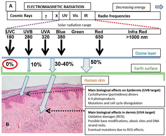 Skin is an important barrier to protect the human body from environmental stress. One of the more important factors causing this stress is sun exposure, due to the energy and free radical generating capacity of sunlight. The solar radiation on the surface of our planet comprises an ample range of electromagnetic radiation [1], including ultraviolet (UV, approximate range of wavelength from 180 to 380 nm), visible (Vis, approximately from 380 to 800 nm), and infrared light (range 1–3 µm approximately). Among the wavelengths reaching the Earth’s surface, UV radiation is the most energetic and potentially harmful (Figure 1A).