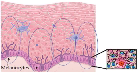 Melanin is produced in specialized cells called melanocytes that are mostly distributed in the epidermal–dermal junction, and then distributed to surrounding keratinocytes, which are the most abundant cells in the epidermis. Melanocytes look like dendritic cells and contain specialized lysosome-lineage organelles called melanosome to synthesize and store the melanin. Melanosomes are transferred from melanocytes to the neighboring keratinocytes through elongated dendrites [9]. The approximate ratio among the population of melanocytes and keratinocytes in the basal layer of the human skin to supply melanin is around 1:30, although this number shows slight variations for different races. One melanin-forming melanocyte surrounded by keratinocytes and some other cell types is called the melano-epidermal unit [10]. In the cytosol of keratinocytes, melanosomes form a critical barrier/shield of DNA by forming perinuclear caps to exhibit photoprotection [11]. The physiological response of skin against solar radiation depends on the production, distribution, type, and quantity of melanin synthesized in melanocytes and transferred to keratinocytes (Figure 2).