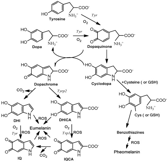Schematic pathway of eumelanogenesis and pheomelanogenesis. Tyr is tyrosinase, the key enzyme catalyzing the rate-limiting step of the pathway, the oxidation of L-tyrosine to L-dopaquinone. Tyrp1 and Tyrp2 are involved in catalytic actions at the final phase of eumelanogenesis (left). Reactive oxygenated species accelerate the polymerization of indole units to eumelanin. Tyrps can also act as stabilizers of tyrosinase. On the other hand, dopaquinone is a pivotal branch point and can react with thiol-containing products, such as L–cysteine or glutathione (GSH), to lead the pathway to phaeomelanin through the intermediates cysteinyl-dopa and benzothiazine compounds (right). DHI, 5,6-dihydroxyindole; DHICA, 5,6-dihydroxyindole-2-carboxylic acid; IQ, 5,6-indolequinone; IQCA, indolequinone-2-carboxylic acid.