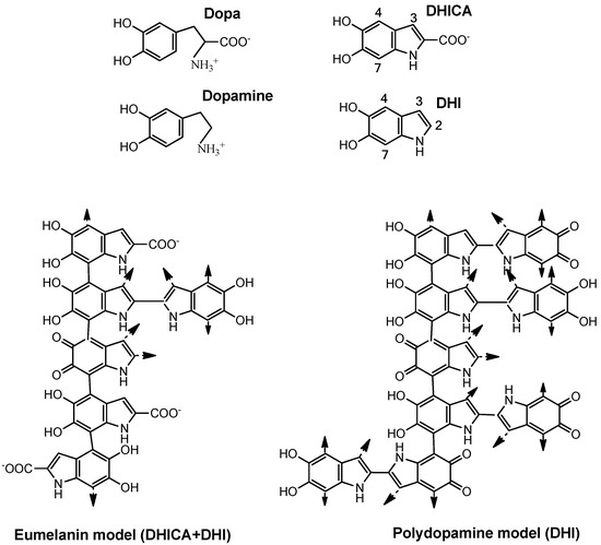 Eumelanin is mainly formed by bonds between positions 4 and 7 of the indole ring, as the carboxyl group of DHICA blocks position 2 and deactivates conjugation to position 3. However, DHI is able to polymerize through positions 2, 3, 4, and 7 (Figure 4), giving place to a larger polymer able to absorb a large amount of UV light due to the large aromatic π-electron clouds [35]. In turn, polydopamine is free of protein and other compounds occurring in natural eumelanins extracted from living organisms.