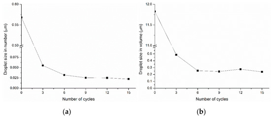 Oil-in-water nanoemulsions were prepared successfully by the HPH method. Regarding operational conditions, there is strong evidence that the droplet size approaches a constant value as the number of cycles increases [35]. Thus, a series of studies employing from 0 to 15 cycles were performed in order to find the optimum number of cycles in the emulsion preparation method before the preparation of samples. A reference composition consisting of an O/W ratio of 20/80 and 5 wt% saponin was employed for analyzing the particle size (in number and volume) of the emulsion considering the number of cycles, and the evolution is shown in Figure 1. It was observed that after six cycles, the droplet size in both number and volume became almost constant even when the number of cycles increased. Therefore, six cycles were employed for preparing the emulsions.