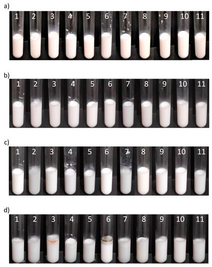 According to the proposed DOE, 11 different formulations were prepared, and their compositions are listed in Table 1. Furthermore, the emulsion appearances, as well as their evolution over time, are shown in Figure 2. The appearance of the emulsions on the day they were prepared can be observed in Figure 2a, where emulsions presented a milky appearance without showing phase separation.