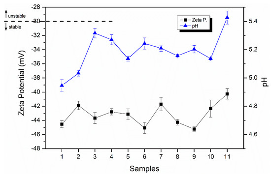 Zeta potential is considered a useful parameter to predict the dispersion stability by measuring the surface charge of droplets [36]. This property can be defined as the value of electrokinetic potential associated to a realistic magnitude of surface charge [37]. It is known that to ensure the physical stability of nanoemulsions, the value of zeta potential should be far from zero, i.e., greater than 30 mV or less than −30 mV. The evaluated samples (Figure 3) had values ranging from −46 to −40 mV, with samples 2, 7, and 11 showing the highest values and the standard deviation being in the range of 0.3–1.2, comparable with values usually found in the literature [13,38]. These results indicated that the emulsions formed with saponin are highly stable, also corroborating the general stability over time previously shown in Figure 2. The negative surface potential value of emulsions stabilized by saponin was also observed in other works. This can be attributed to the carboxylic acid groups presented in the adsorbed saponin molecules [13,17]. Moreover, zeta potential results supported that saponin-coated particles were mainly stabilized by the electrostatic repulsion generated between the highly negatively charged droplets [31].