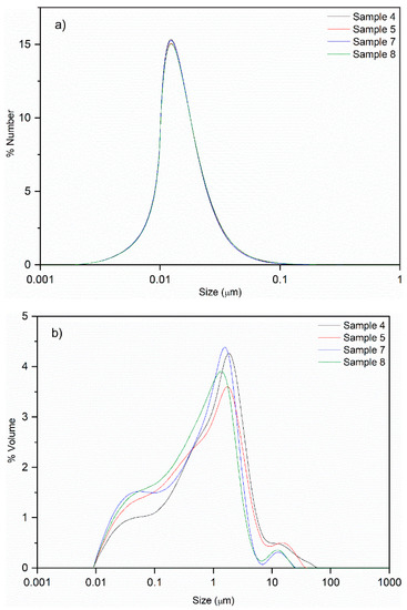 Another valuable property that has a direct effect on long-term stability, texture, and optical appearance of emulsions is the droplet size, with the average values, i.e., the particle size centered in 50% of the measured nanoparticles, obtained by dynamic light scattering (DLS; Section 3.5) being reported in Table 2. Particle size results in number showed very small particle sizes, ranging from 17 to 20 nm, while the data in volume varied between 1.1 and 4.3 µm, approximately. The large difference between the values in number and volume is based on the scattered light intensity in relation to the particle volume. When particle size and distribution are measured in volume, the larger particles give stronger intensity, even if they are present at small amounts [39], due to their surface volume comparing with smaller particles. Figure 4 shows both profiles (in number and volume) of the particle size distribution for samples 4, 5, 7 and 8 (all using O/W ratios of 10/90). The small peak close to 10 µm in the volume distribution curves (Figure 4b) indicated the presence of large particles that could cause the different outcomes in the number and volume profiles presented in practically all samples. It was also noticed that volume distribution profiles of the curves, according to the amount of oil, presented the same behavior (Figure 4b—10/90, Figure S1.1b—20/80, and Figure S1.2b—30/70). Complete information about size distribution for other samples and the corresponding D-values (D10, D50, and D90) for all samples (Table S1), are reported in the Supplementary Materials. However, the results in number presented quite similar values between the different samples, indicating that the small particles in all samples were alike, as can be seen in Figure 4a. For that reason, considering the decisive effect of the particle size in volume in the samples, this was chosen to perform the statistical analysis for stability studies (Section 2.3).