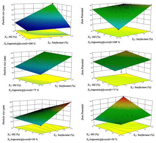 The optimal oil and surfactant percentages, as well as the saponin/glycerol ratio, were the variables selected to evaluate the best operating conditions to minimize the particle size (in volume) and obtain zeta potential values in the stable range. The analysis was carried out using a 2k full-factorial design with three factors and three replicates of the central point. The three independent factors (oil, surfactant, and saponin/glycerol levels, corresponding to the actual factors x1, x2, and x3, respectively) were studied at three levels (−1, 0 and +1), as shown in Table 4, resulting in 11 experiments that were carried out randomly.