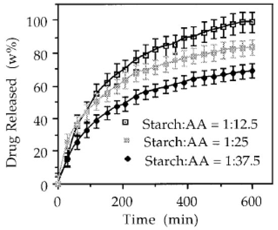 | SPI | PAA | Covalent linking by Schiff base reaction of peptides from SPI with PAA (in the presence of GA) or self-assembly by noncovalent hydrophobic interactions (without GA) | With or without GA | Drug sustained release hydrogels for globular proteins (BSA) with excellent pH sensitivity, good water uptake, and high capacity of BSA absorption | [366] |
