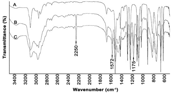 In the spectra of both ionic liquids, there were observed bands at 2250, 1572, and 1175 cm−1, which were not registered in the spectrum of methylimidazole. The bands at the 2250 and 1572 cm−1 can be attributed to the stretching and deformation vibrations of positively charged nitrogen, respectively. The band in the region of 1170 cm−1 can be attributed to the C-C stretching vibration coming from the alkyl chain of ionic liquids. In the spectra, there are bands of ring stretching symmetries that occur at 1562 cm−1 (N=C) and 1450 cm−1 (CH2(N), CH3(N)CN). Moreover, there are observed peaks at 1085 cm−1, which could arise due to the N-C bond, and at 692 cm−1, which could be attributed to the C-H bond [40,41].