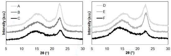 XRD patterns of cellulose after hydrolysis reaction with ionic liquids: (A) Avicel, (B) Avicel treated with [EMIM][Cl], (C) Avicel treated with [PMIM][Cl], (D) Sigmacell, (E) Sigmacell treated with [EMIM][Cl], and (F) Sigmacell treated with [PMIM][Cl].