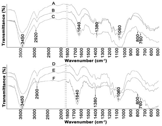 FTIR spectra of: (A) Avicel, (B) Avicel treated with [EMIM][Cl], (C) Avicel treated with [PMIM][Cl], (D) Sigmacell, (E) Sigmacell treated with [EMIM][Cl], and (F) Sigmacell treated with [PMIM][Cl].