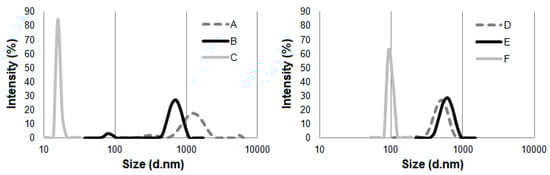 The average particle size of the cellulose before and after treatment with ionic liquids: (A) Avicel, (B) Avicel treated with [EMIM][Cl], (C) Avicel treated with [PMIM][Cl], (D) Sigmacell, (E) Sigmacell treated with [EMIM][Cl], and (F) Sigmacell treated with [PMIM][Cl].