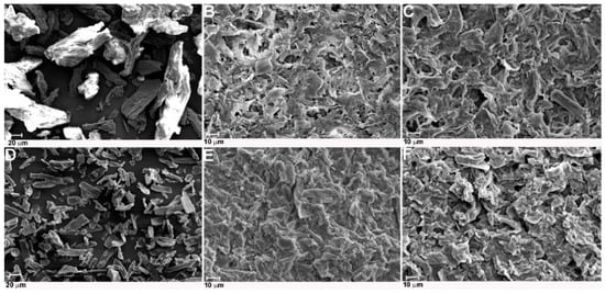 SEM images of (A) Avicel, (B) Avicel treated with [EMIM][Cl], (C) Avicel treated with [PMIM][Cl], (D) Sigmacell, (E) Sigmacell treated with [EMIM][Cl], and (F) Sigmacell treated with [PMIM][Cl].
