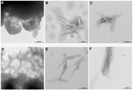 TEM images of (A) Avicel, (B) Avicel treated with [EMIM][Cl], (C) Avicel treated with [PMIM][Cl], (D) Sigmacell, (E) Sigmacell treated with [EMIM][Cl], and (F) Sigmacell treated with [PMIM][Cl].