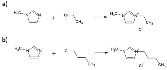 Both ionic liquids were synthesized in a one-step reaction. The reaction substrates of the first ionic liquid synthesis were 1-methylimidazole, 1-chloroetane, and acetonitrile at a molar ratio of 1:1:10. The 1-methylimidazole, 1-chloropropane, and acetonitrile at a molar ratio of 1:1:10 were used to synthesize the second ionic liquid. Both mixtures were stirred under a reflux condenser at 90 °C for 24 h. The products of reactions were washed with heptane at 70 °C. Next, the solvent was removed using a rotary evaporator (BUCHI Labortechnik AG, Flawil, Switzerland). The final products of synthesis reactions were 1-ethyl-3-methylimidazolium chloride [EMIM][Cl] and 1-propyl-3-methylimidazolium chloride [PMIM][Cl]. The scheme of the ionic liquids synthesis is shown in Figure 7.