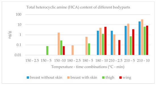 Although there are a number of bibliographic data in the scientific literature on the formation and profiles of HCAs, the data refer mostly to mammalian meat types [17,18], and less frequently to poultry meat [9,19]. In addition, the information available for poultry meat is incomplete in terms of main factors affecting the formation of HCAs, such as the body parts (e.g., breast, thigh, wings), the presence of skin, and the role of the temperature-time combination used for heat treatment.