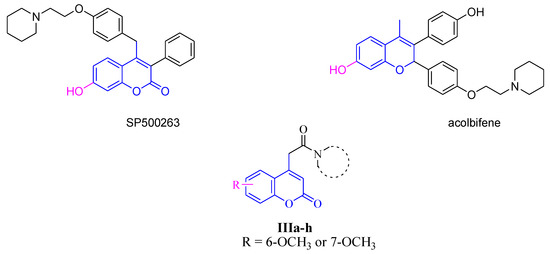 During the identification of potent coumarin-based selective estrogen receptor modulators (SERM) compounds, the goal was to find a potent estrogen inhibitor with an interleukin-6 (IL-6) inhibitory activity [14]. The presence of an amine side-chain in compound SP500263 (Figure 1) plays a key role in determining its SERM activity; however, this compound also showed undesirable agonist activity in the MCF-7 proliferation assay [15,16]. The core structures of SERMs are diverse, including triphenylethylene [17,18], benzothiophene, chromene (benzopyran) [19,20,21,22,23], naphthalene, indole, and steroid derivatives [24].